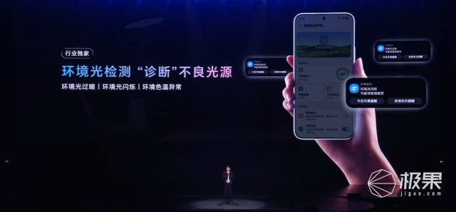 护眼方面还支持了包括照明闪烁检测、AI视觉健康管理、AI动态离焦、环境光检测等,能实时监测灯光的健康与否,这下等于买个手机,就把万元的灯光监测仪带回家了。