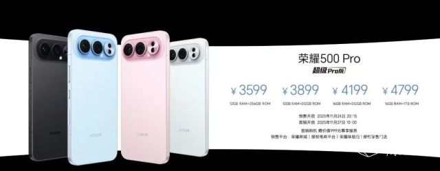 荣耀500 Pro版:12GB+256GB、12GB+512GB、16GB+512GB和16GB+1TB版本售价分别为3599元、3899元、4199元和4799元 。