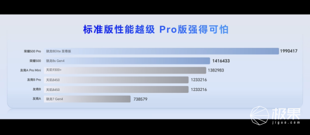 官方还晒出跑分对比,荣耀500系列同档位第一。