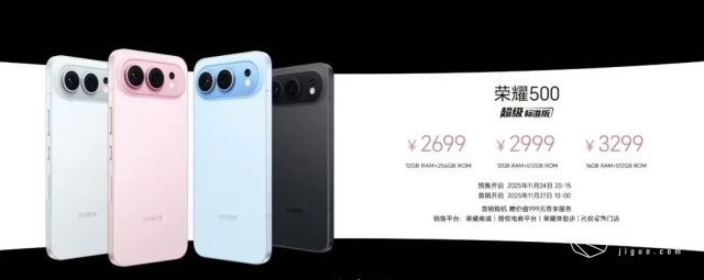 荣耀500标准版:12GB+256GB、12GB+512GB和16GB+512GB版本售价分别为2699元、2999元和3299元。