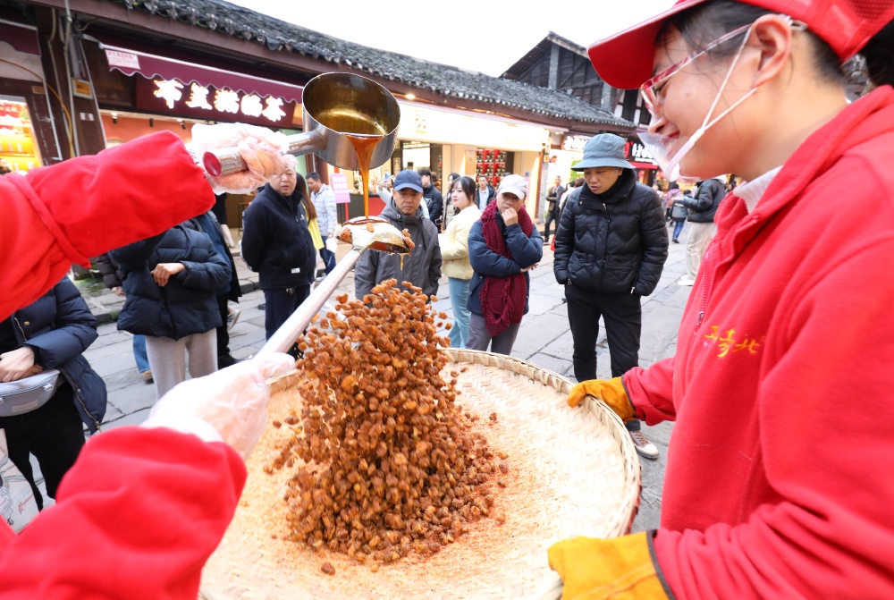 ▲12月23日,沙坪坝区磁器口古镇景区,游客正在观看当地特产的制作过程。特约摄影 孙凯芳