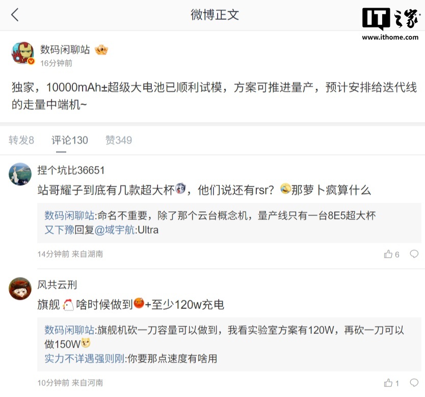 根据先前该博主的爆料汇总,目前有多款国产手机进入万级大电池竞争时代。他曾在本月中旬发布消息称,某厂的 10000mAh± 超级大电池已顺利试模,方案可推进量产,预计安排给迭代线的走量中端机。