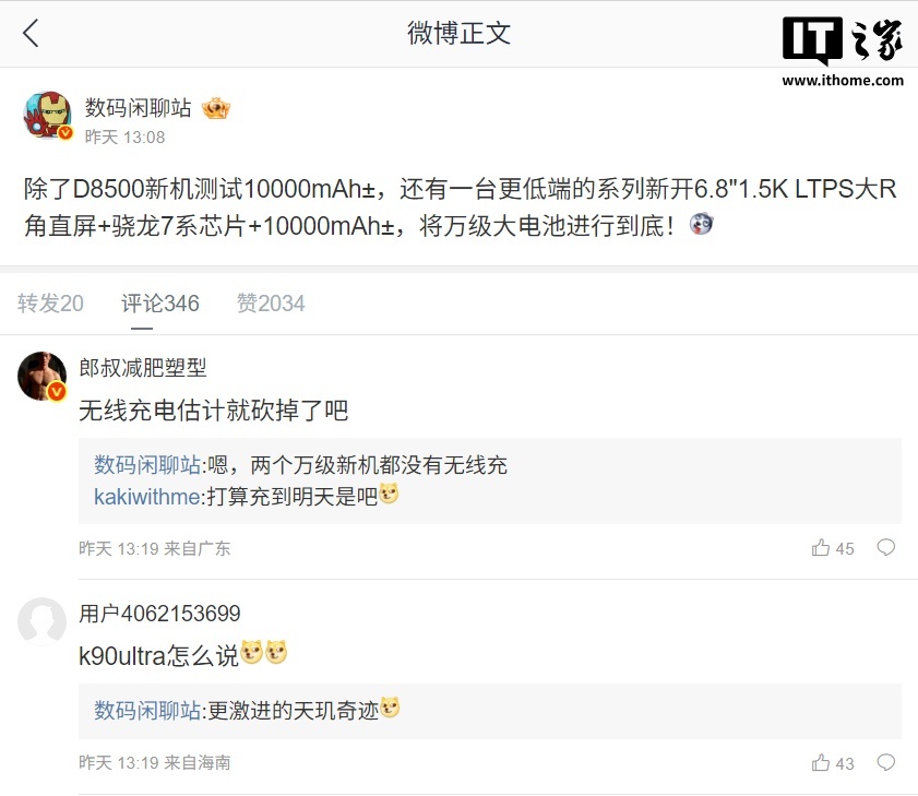该博主曾多次爆料其他的 10000mAh 电池方案,并在本月更早前提到将有两款 10000mAh± 电池的新机,其中一款搭载天玑 8500,另一款属于更低端的系列,搭载 6.8 英寸 1.5K LTPS 大 R 角直屏 + 骁龙 7 系芯片。